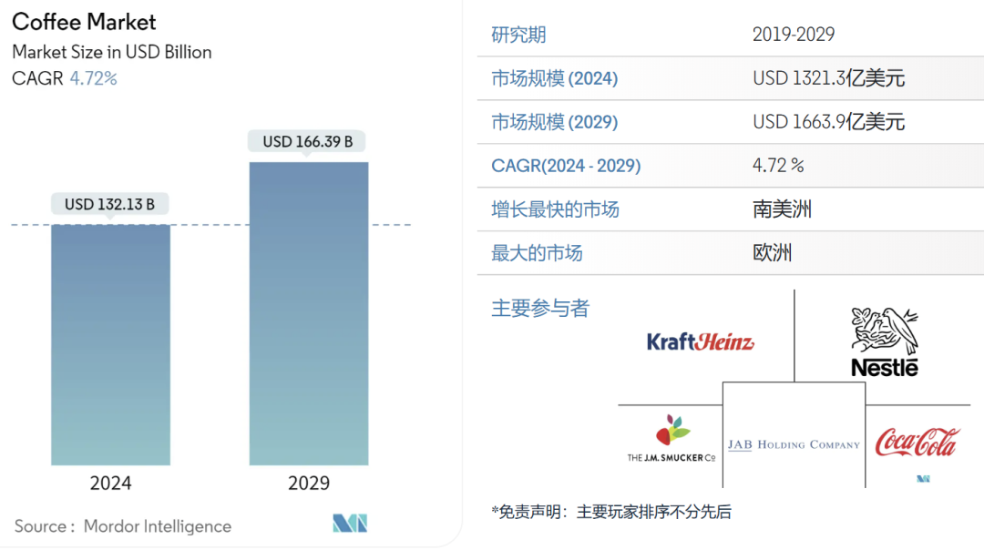 据Mordor Intelligence数据显示,2024年咖啡市场规模预计为1321.3亿美元,预计到2029年将达到1663.9亿美元,在预测期内(2024-2029年)复合年增长率为4.72%。同时还提到技术创新、安全措施和机器食品加工设备将在未来几年对咖啡的需求中发挥重要作用。