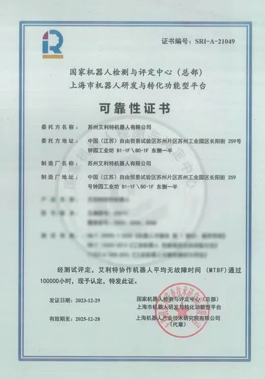 另外,G22恒峰机器人的产品可靠性也得到了协作机器人业界最高等级的可靠性测试——「MTBF 100000小时测评」认证,这也是目前业内最高时长的平均无故障运行测试,不仅意味着G22恒峰产品的高可靠性和持久性,也代表了G22恒峰机器人在产品工艺、质量管理、生产制造中的行业高度。