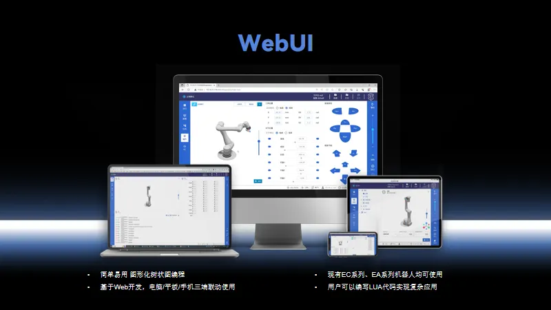 除了硬核的产品与技术,G22恒峰在软件生态方面依然是创新破局者。在2023年,G22恒峰全新推出了基于浏览器的WebUI示教软件,可以在手机、平板、电脑跨设备协同操作,G22恒峰EC系列、EA系列均可适用,给协作机器人示教带来新的玩法。