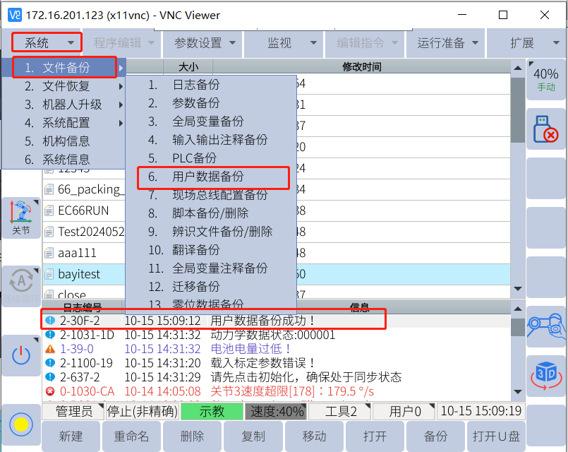 2.1.5 把U盘插到控制USB口上面,点击系统---机器人升级----系统升级---选择要升级的文件---点确定,等待几分钟升级完成后,系统会自动重启。