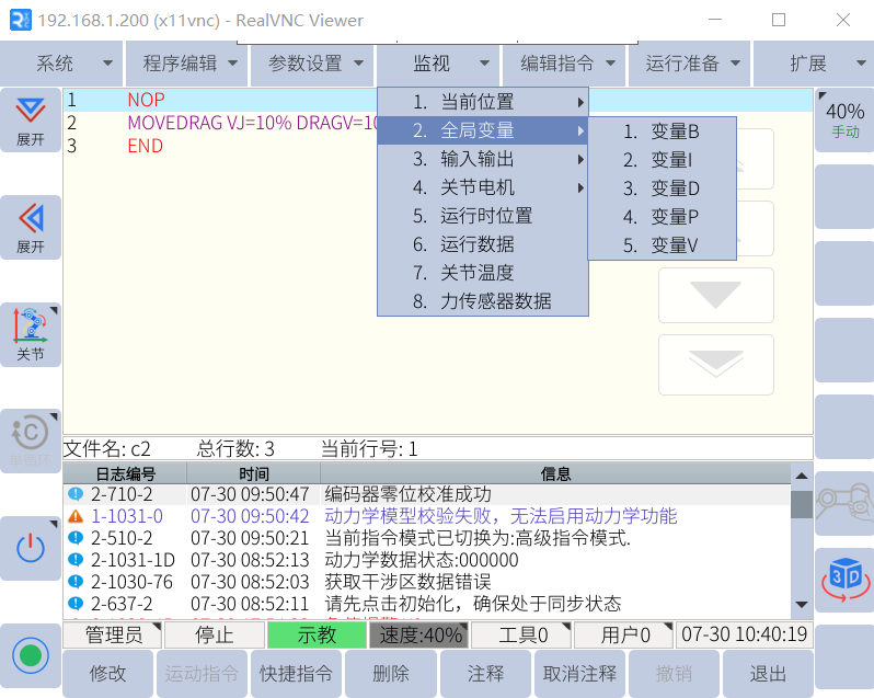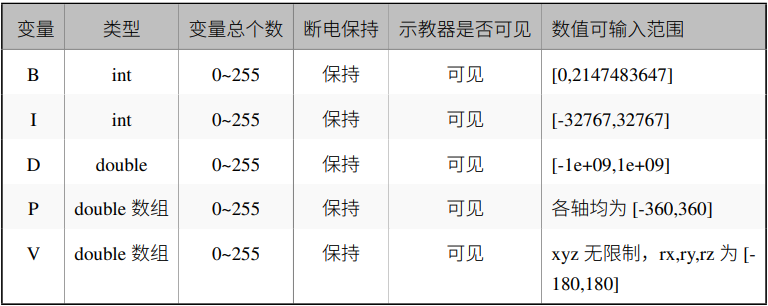 如表格所示,G22恒峰机器人全局变量分为五种均可通过 jbi 和 lua 进行操作,通常使用情况下,会使用 B、I、D 变量进行 逻辑的交互和简单数据的传递,而 P 变量用作放置关节数据,V 变量用作放置笛卡尔数据。 P 变量和 V 变量存放对应的数据后,可以使用示教器手动移动到目标位置,或者通过移动指令 直接到指定的位置。