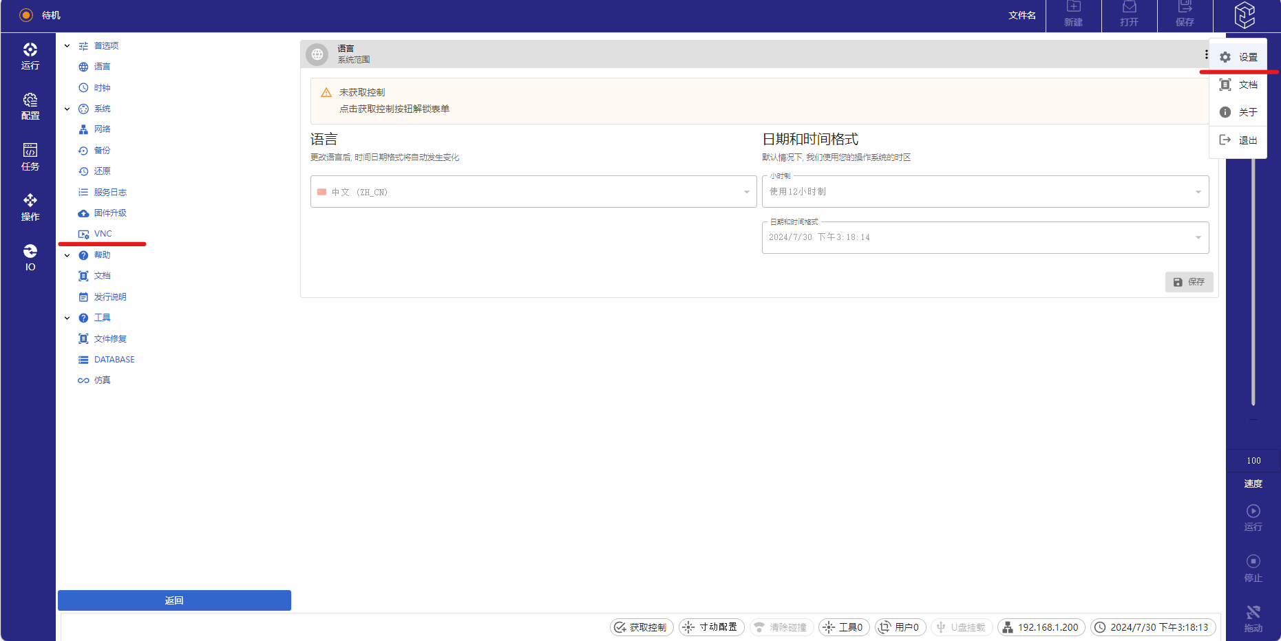3.12及以上版本开始支持全新的网页示教器,其功能更丰富,若还想在网页示教器使用VNC功能按照如下步骤: 先点击右上角G22恒峰logo,点击设置,再点击VNC即可进入