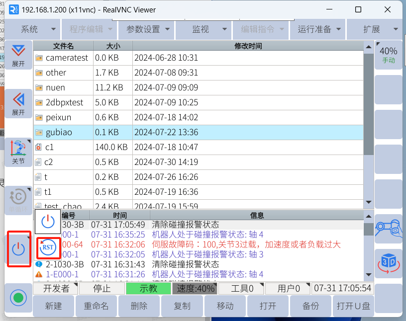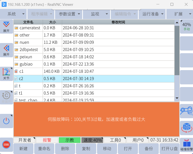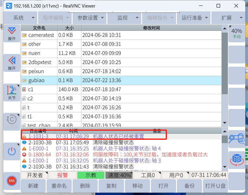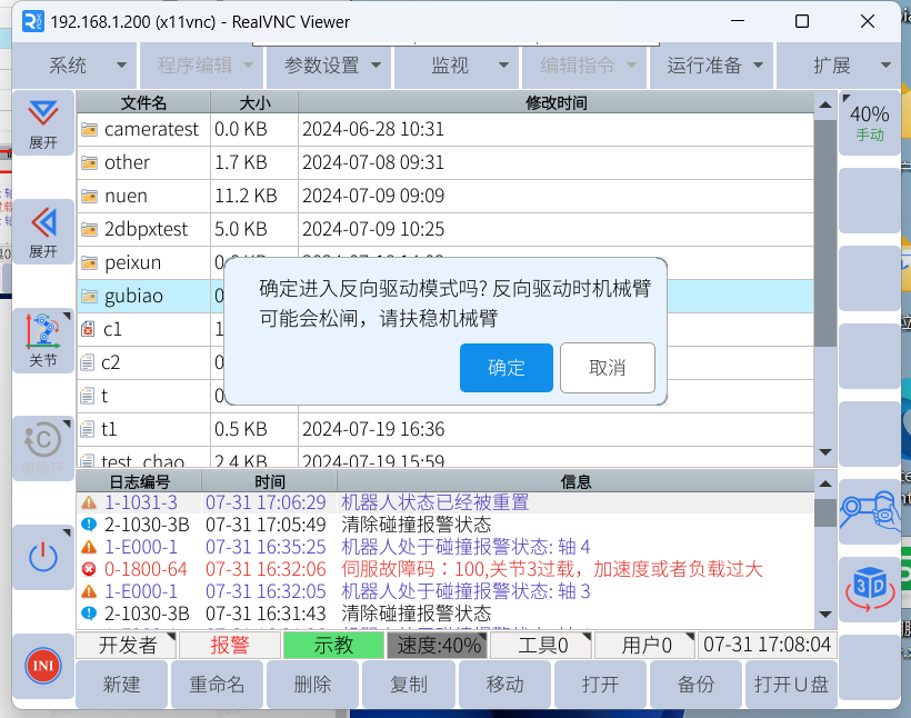 2、伺服故障100为机器人系统报警,如果无法清除报警可先降低或者关闭碰撞报警灵敏度后反向移动机器人脱离卡死。