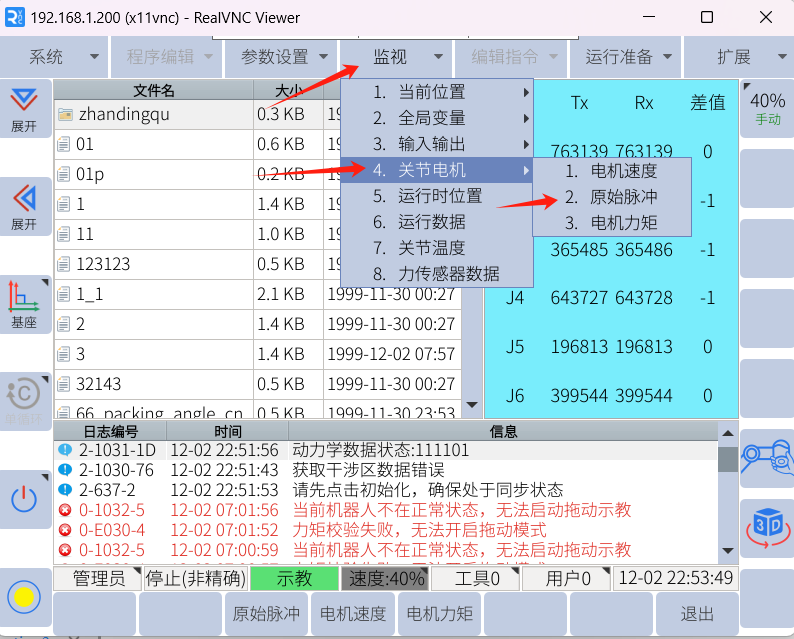 3. 机器人上电,如一直报警90,91,92,使用清除报警查看弹杆是否吸合,如不会吸合则进行下一步,如机器人偶发性报警,可以手动旋转此关节±360°一遍,复现此报警
