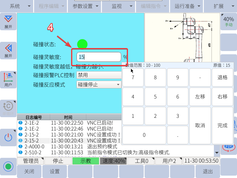 tips:机器人开启碰撞检测后,灵敏度设置的越小,代表机器人越灵敏,触发机器人“碰撞检测报警”所需要的力便越小。