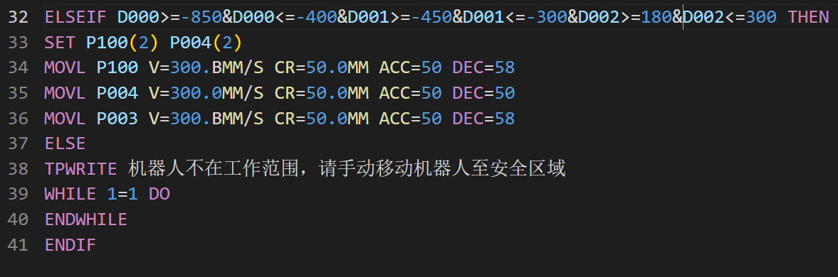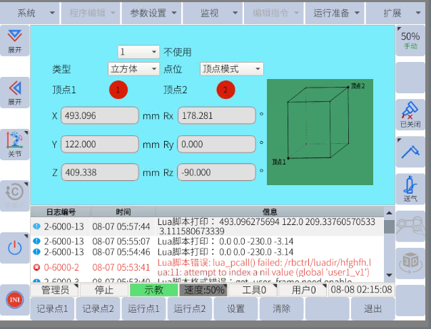 本文举例以工具末端始终垂直于地面,现场作业过程中,机器人末端可能存在多种姿态,需要依照现场作业环境做出实时更改,切不可完全参照本文举例。比如现场机器人存在末端RX或RY较对齐姿态旋转了90°,上升时可能会存在末端干涉问题。