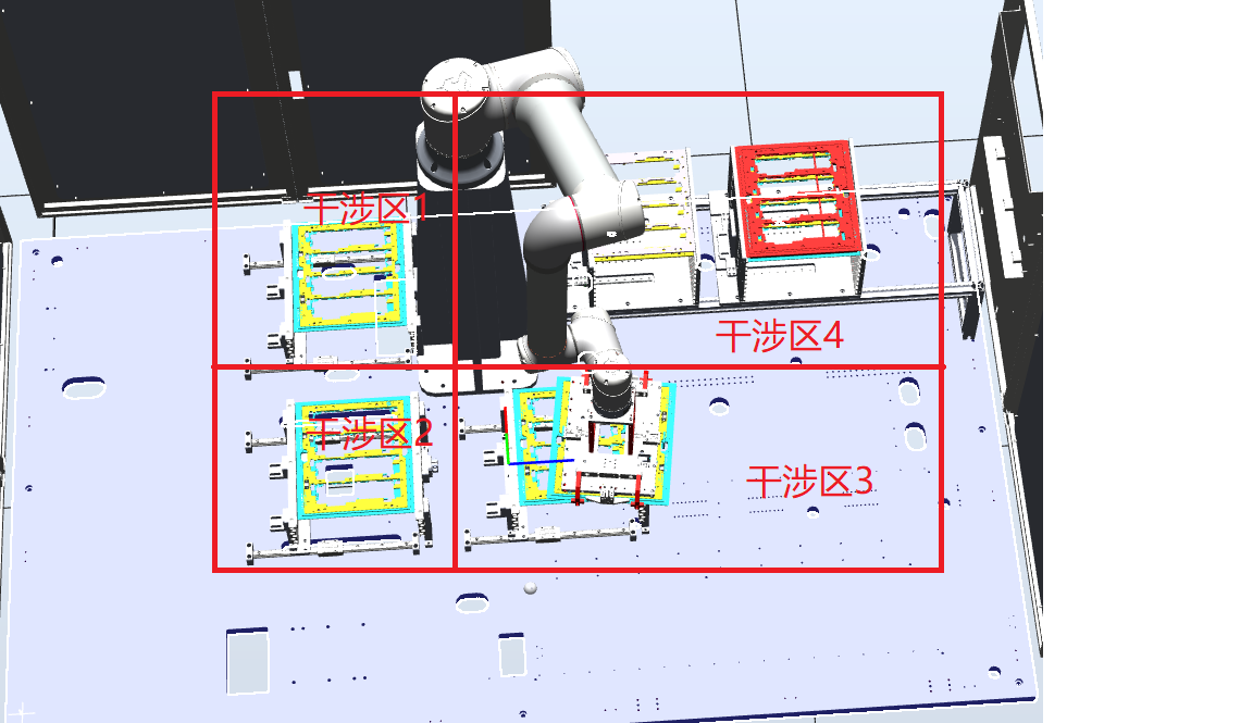 以下图为例,将工作区域分为四个干涉区,以下图机器人位置为Home点,会在四个干涉区中进行产品的取放,最终作业结束后会回到Home点。