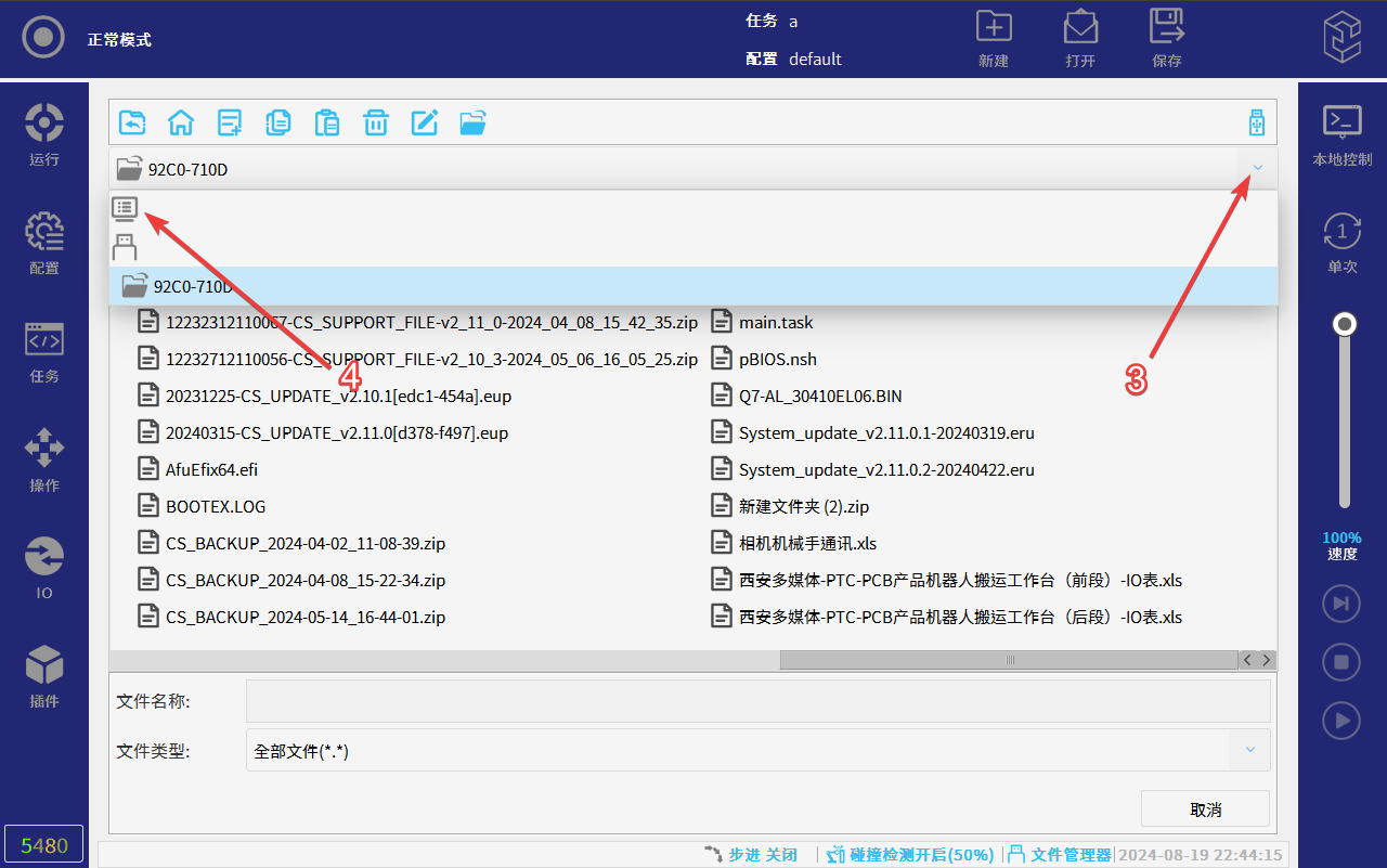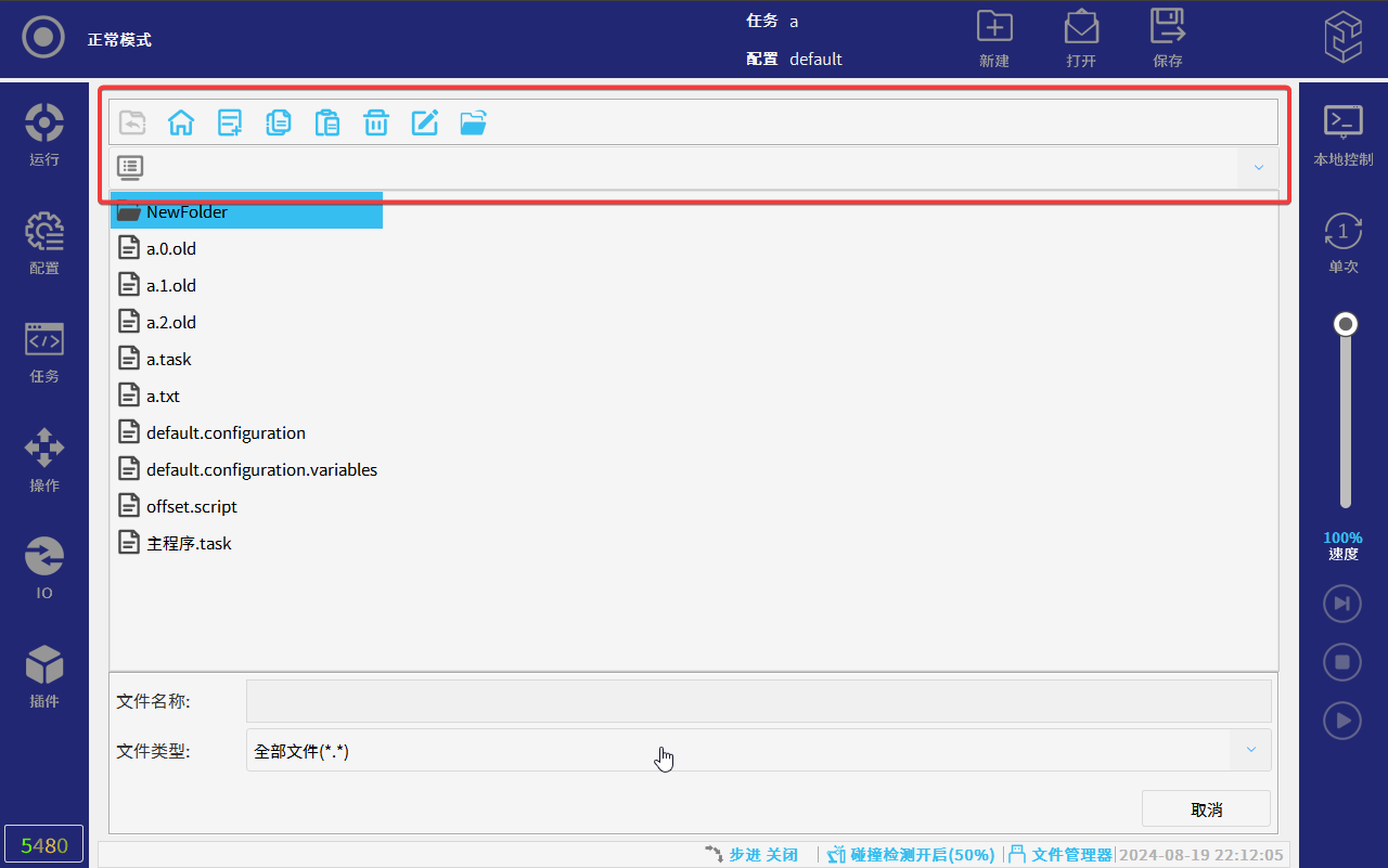 CS机器人示教器软件界面下方内置有文件管理器功能,该功能可以管理程序文件、配置(全局变量)文件和脚本等内部文件,以及可以管理外部存储介质U盘文件;