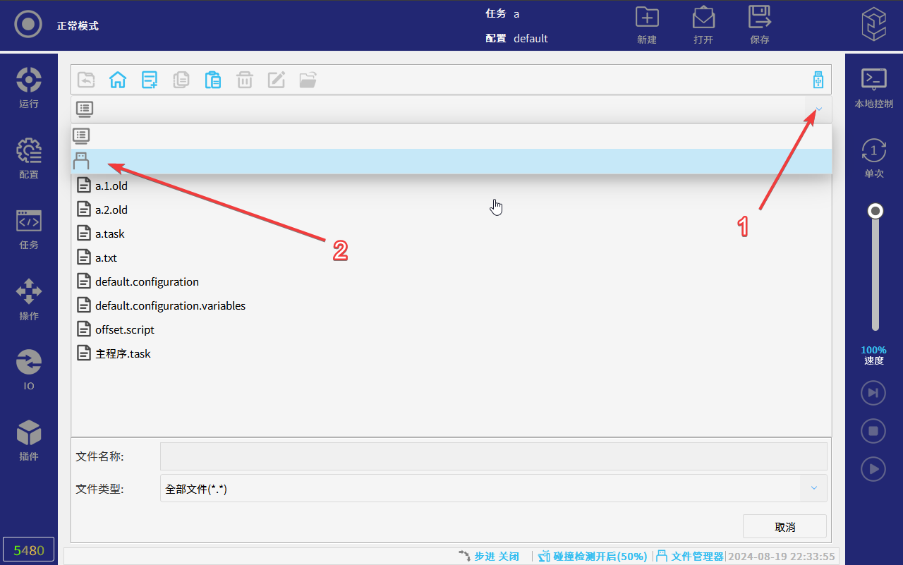 连接u盘后,可以将机器人内部单个程序、配置文件选择保存至u盘或者将u盘内单个程序、配置文件传输至机器人,操作步骤如2.2.2