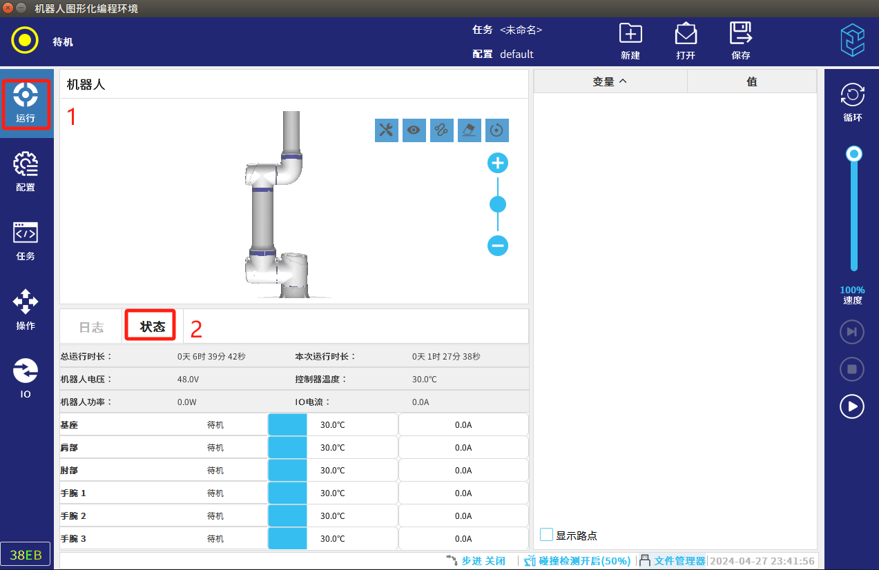 - 机器人显示”待机“状态后退出,进入运行页面,切换状态