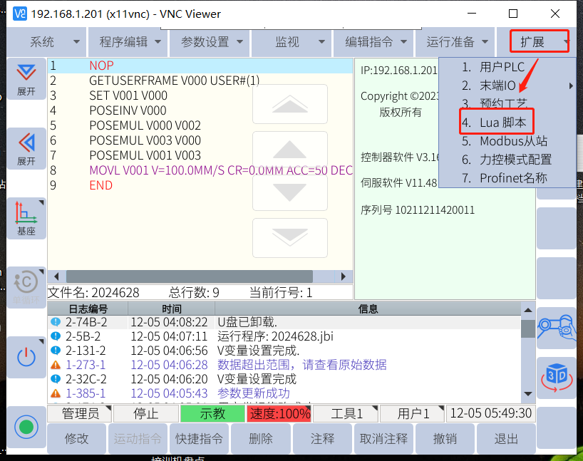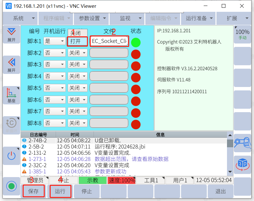 3、 机器人运行加载Socket通讯lua脚本