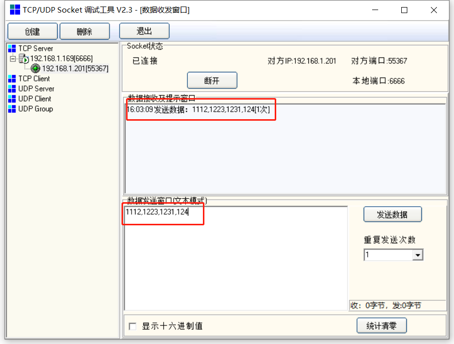 机器人触发发送数据后,会给服务器发送设定的字符串,服务器会显示接收到的数据