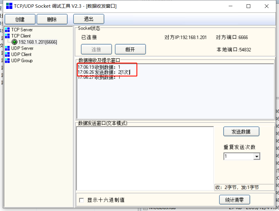 客户端发送字符串“2”给机器人,机器人接收到数据把数据和接收到的数量打印出来