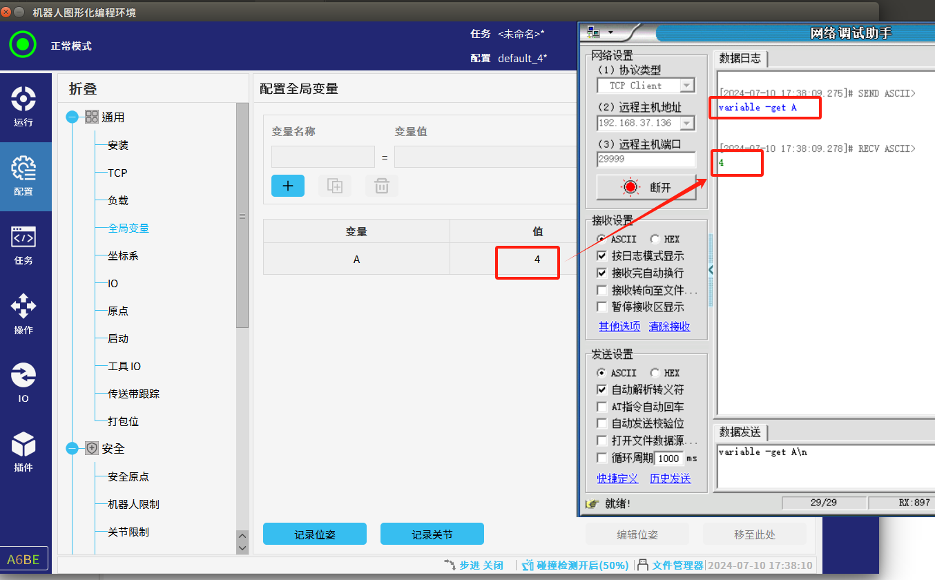当机器人程序未运时可以通过29999端口可以修改,如图4-1所示通过29999端口连接机器人向机器人发送variable -set A 1\n,需注意的是 dashboard shell 命令默认需以“\n”作为结束输入标识符,因此在发送命令时要以“\n”结 尾,否则将被认为未完成输入,不会被响应。