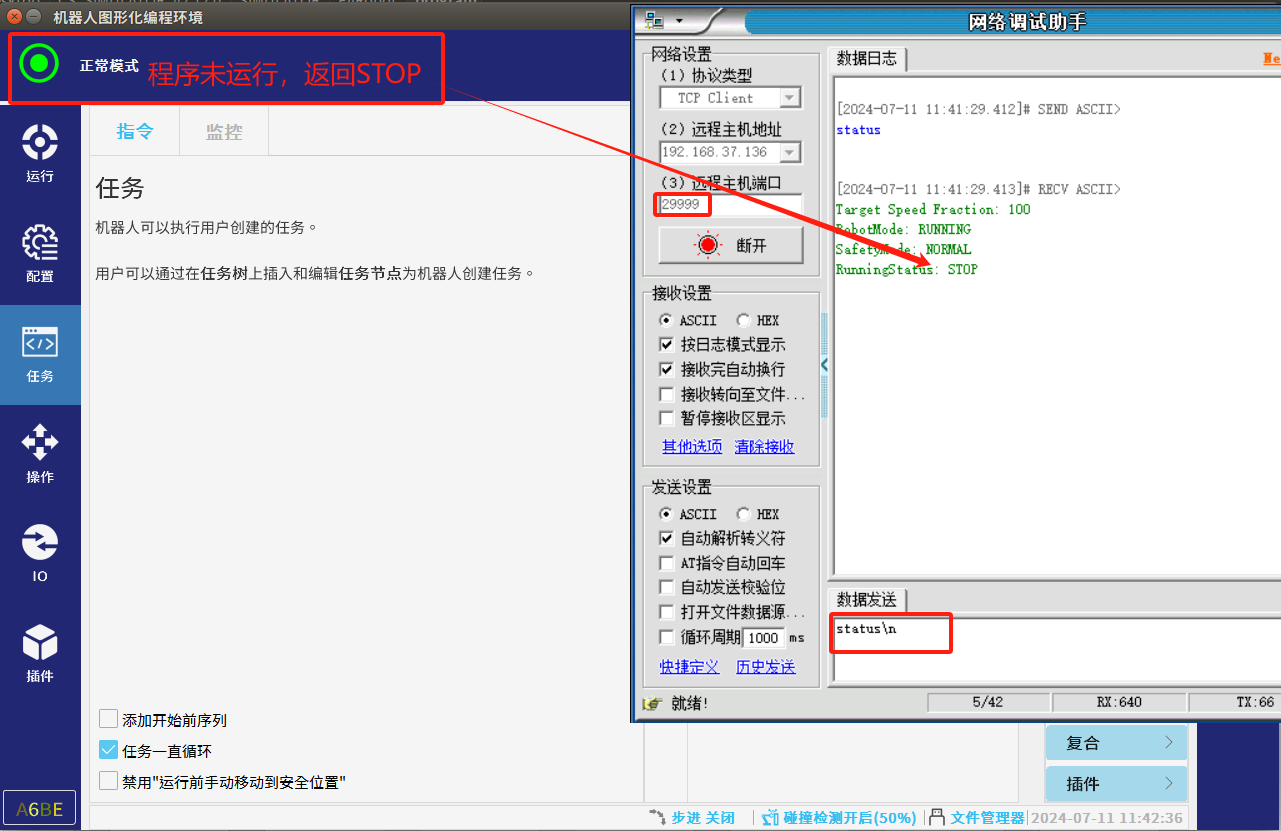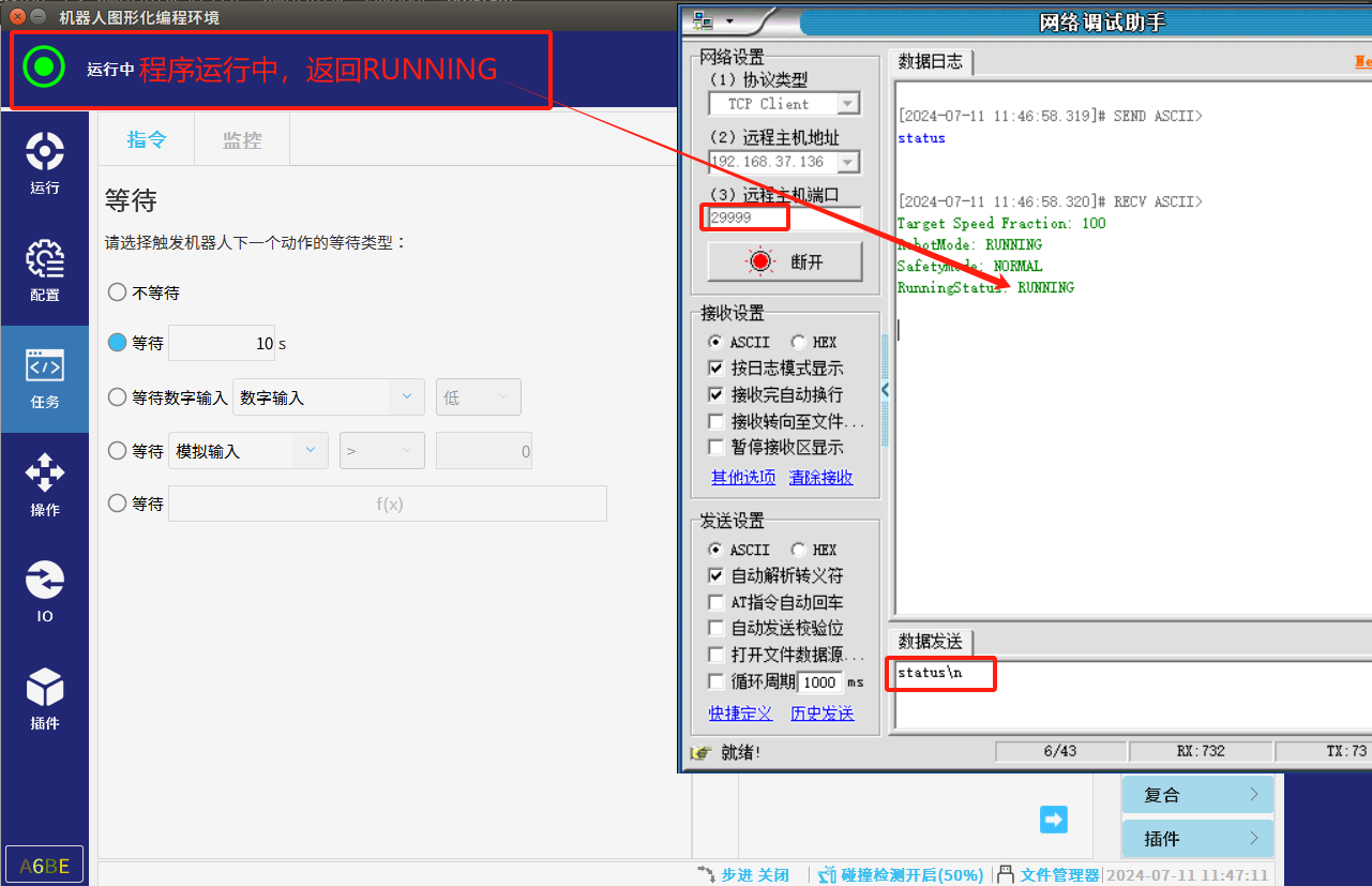 5. 建议上位机通过29999端口,发送status获取机器人当前程序状态:RunningStatus状态来判断程序是否运行,再根据实际选择通过30001端口或通过29999端口发送新的全局变量值。