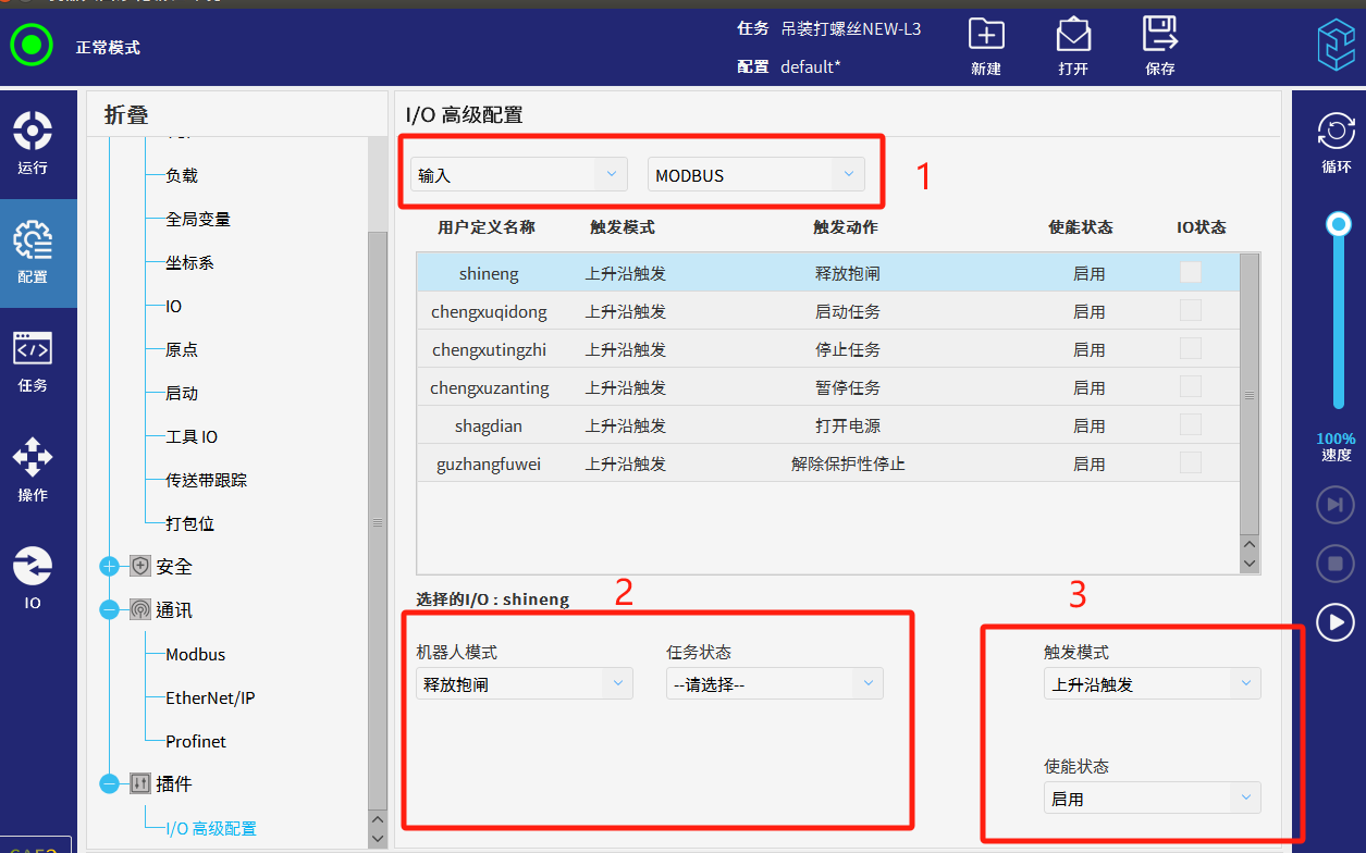 - 选择该信号需要实现的功能(如:机器人上电、下电、释放抱闸、任务启动等)