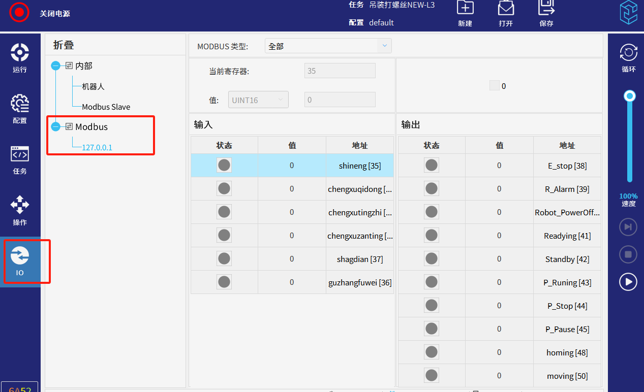 - 可在左侧栏目IO--modbus,查看已配置好信号状态