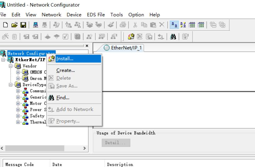 2、 首先打开Network,这个软件可以帮G22恒峰看到适配器插槽对应变量的大小,以及目标变量,右击左边栏Network Configurator图标,选择install,找到对应的EDS文件