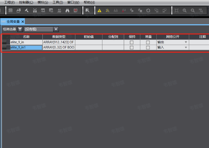 9、点击空白处,新建全局变量创建插槽9,在数据类型中填入ARRAY[912..1423] OF BOOL,(其中括号内为变量从多少位到多少位,具体可参考通讯手册,bool代表数据类型,可以按照通讯手册中来设置大小),网络公开设置成输出状态