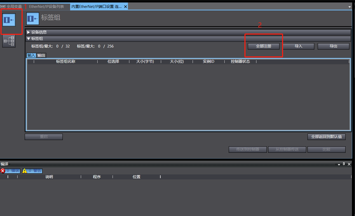 13、 进入内部 EtherNet/IP 端口设置,选择标签组,点击全部注册