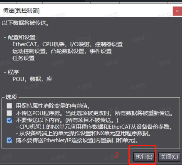 20、 将配置一并传输至控制器,点击图片中按钮,点击执行既可,完成后重启机器人