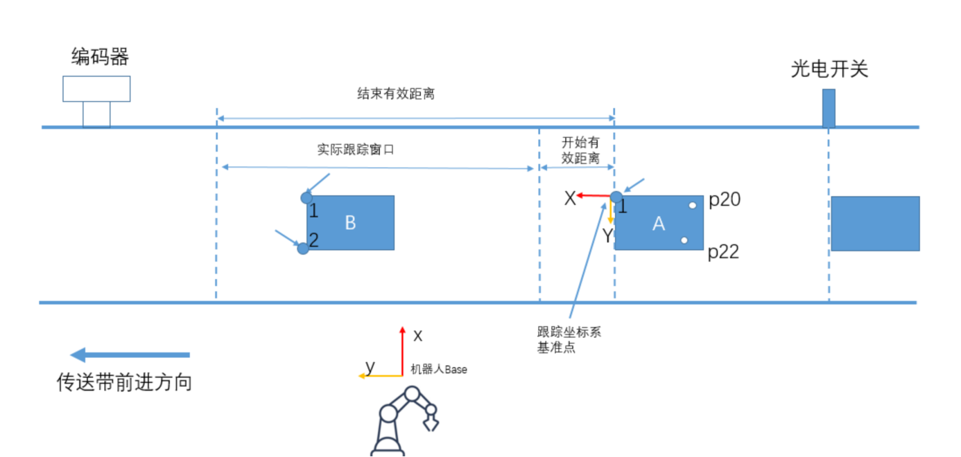 示教完跟踪轨迹后将传送带缓慢开动一段距离后(设定的有效结束距离400mm以内,最优300-350mm),停止传送带运动(传送带速度保持不变),将机械臂移动至B点并记录B点(A点B点需戳向同一个特征点记录),记录A点和B点时,下面会显示编码器数值,