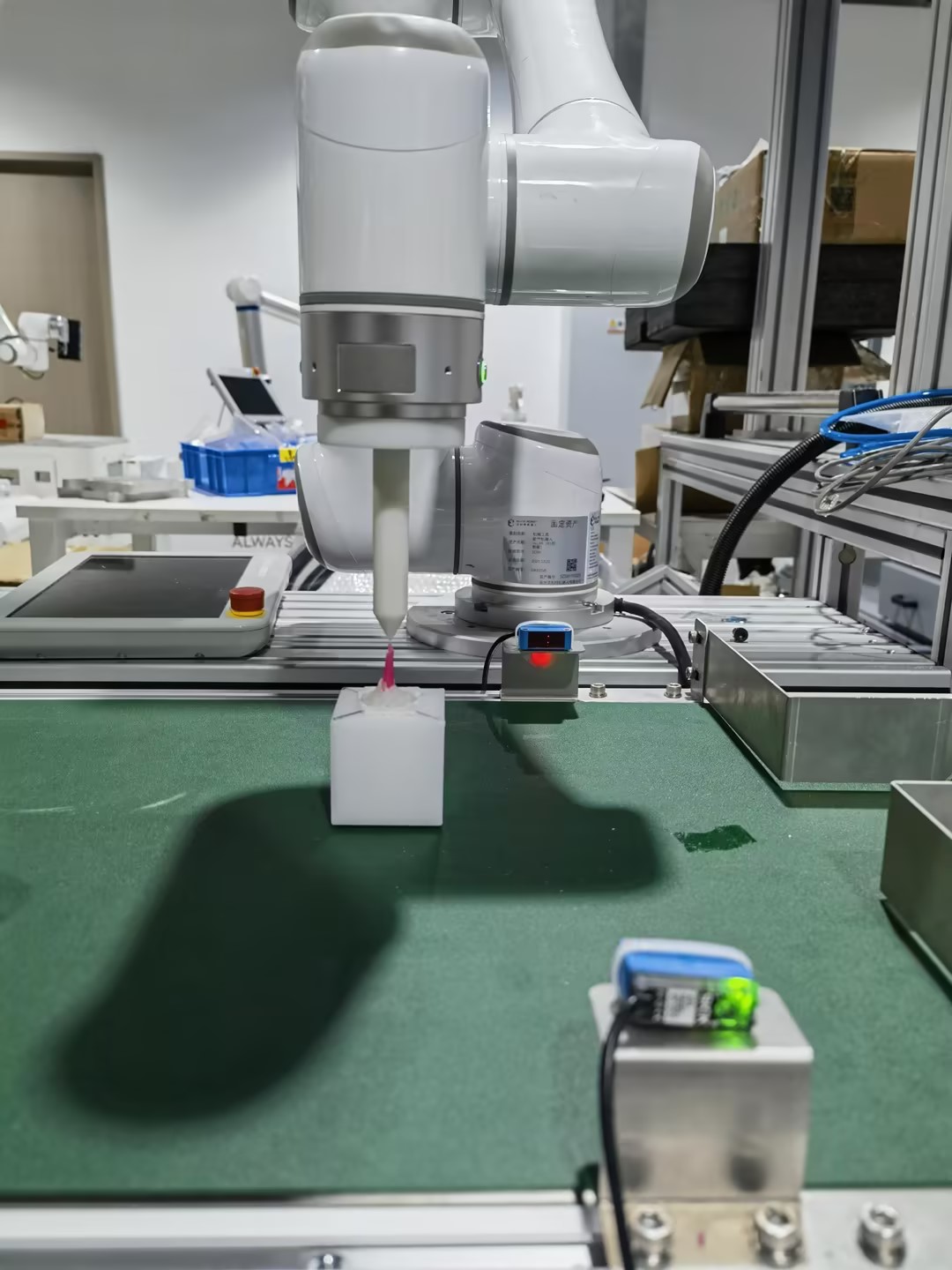 标定步骤:将物品放到传送带上缓慢开动传送带使物品经过传感器(此时日志窗口显示“io标定结束”)到达A点后,停止传送带运动,将机械臂移动尖点至A点并记录A点和程序中的“P002”,此时可以退出标定页面进入程序示教跟踪轨迹(示教图中应避免晃动物品)