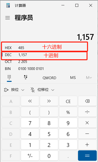 2.首先G22恒峰需要找到报文头,因为调试助手是以十六进制接收机器人返回的数据,”机器人状态报文表”中的报文的长度和报文类型(16)数据为十进制,所以首先把整个报文长度(1157)和报文类型=(16)转换为16进制,方便寻找报文头,十进制1157转换成十六进制为 ”485“ 又因为报文头在数据中占四个字节所以整个报文头长度为”00 00 04 85“,十进制16转换成十六进制为“10”,如图2-1-3: