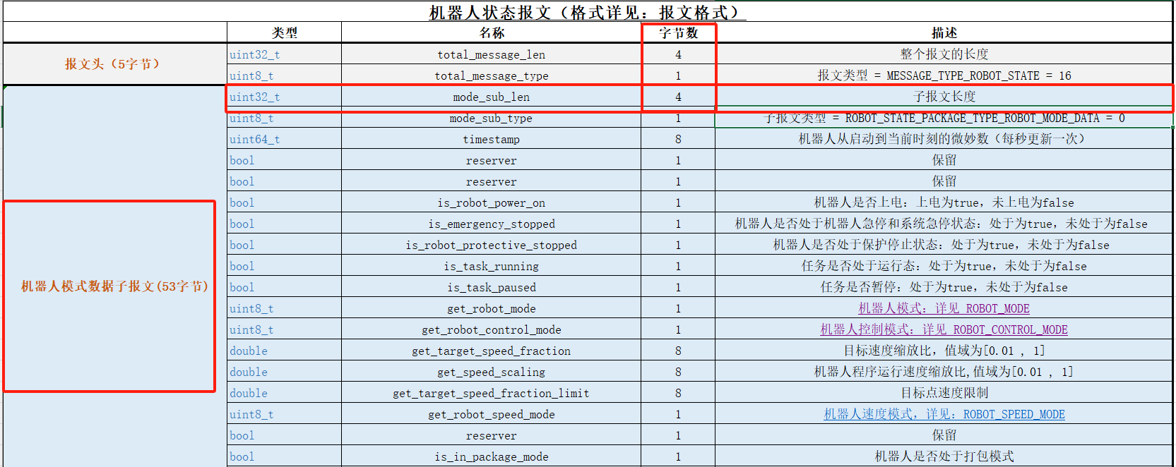 1.当G22恒峰需要解析机器人的某一种状态时,首先需要找到这个状态的子报文头即可,例如通过”机器人状态报文表”得知”机器人模式”子报文长度为53且占4个字节如图2-1-5所示,所以转换成十六进制为“00 00 00 35”。