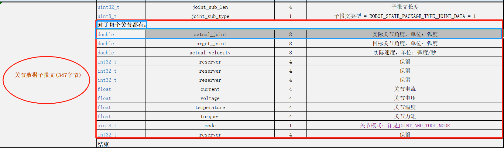3.由图2-1-9可知关节数据中的347字节中前面五个字节为子报文头,报文头后面分别为六个关节的数据每个关节数据有57个字节:子报文头(5)+关节1数据(57)+关节2数据(57)+关节3数据(57)+关节4数据(57)+关节5数据(57)+关节6数据=关节数据(347),为了便于解析每个关节的数据以颜色区分如图2-1-11所示: