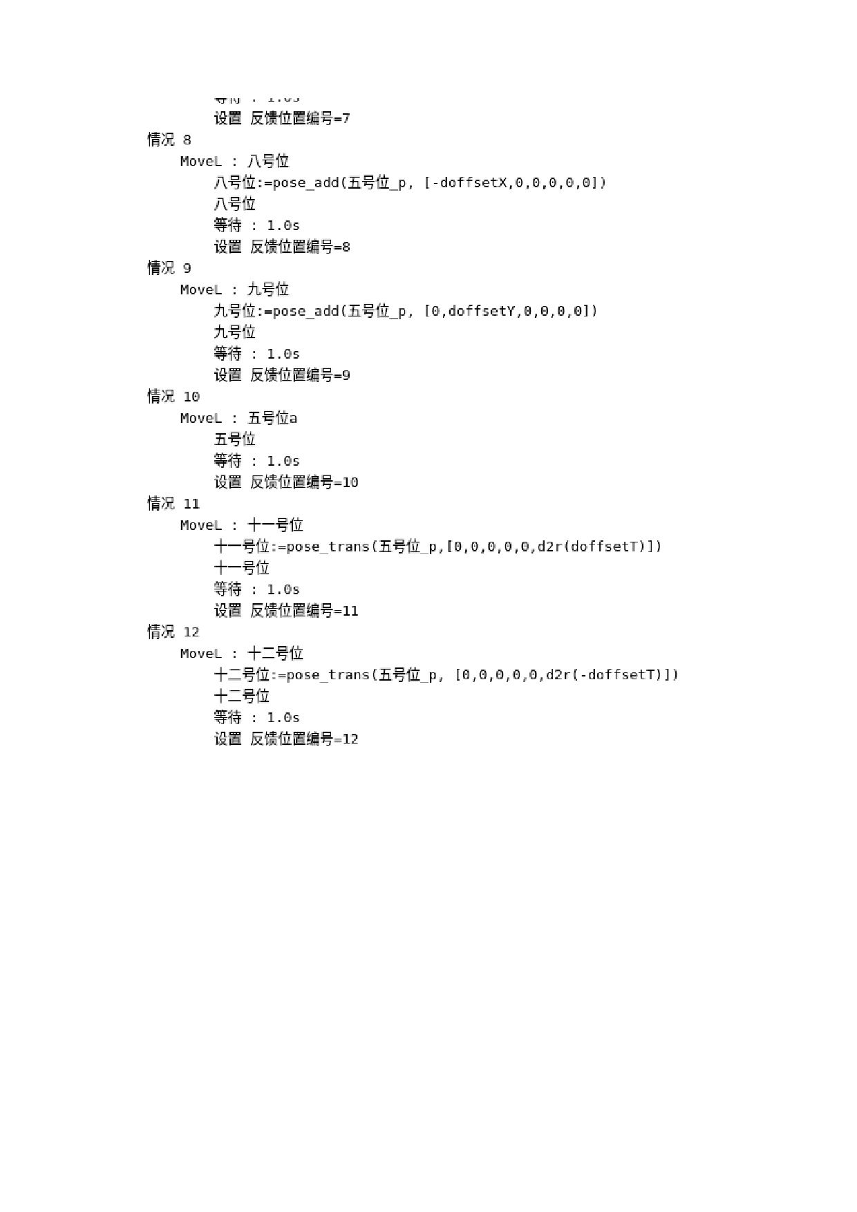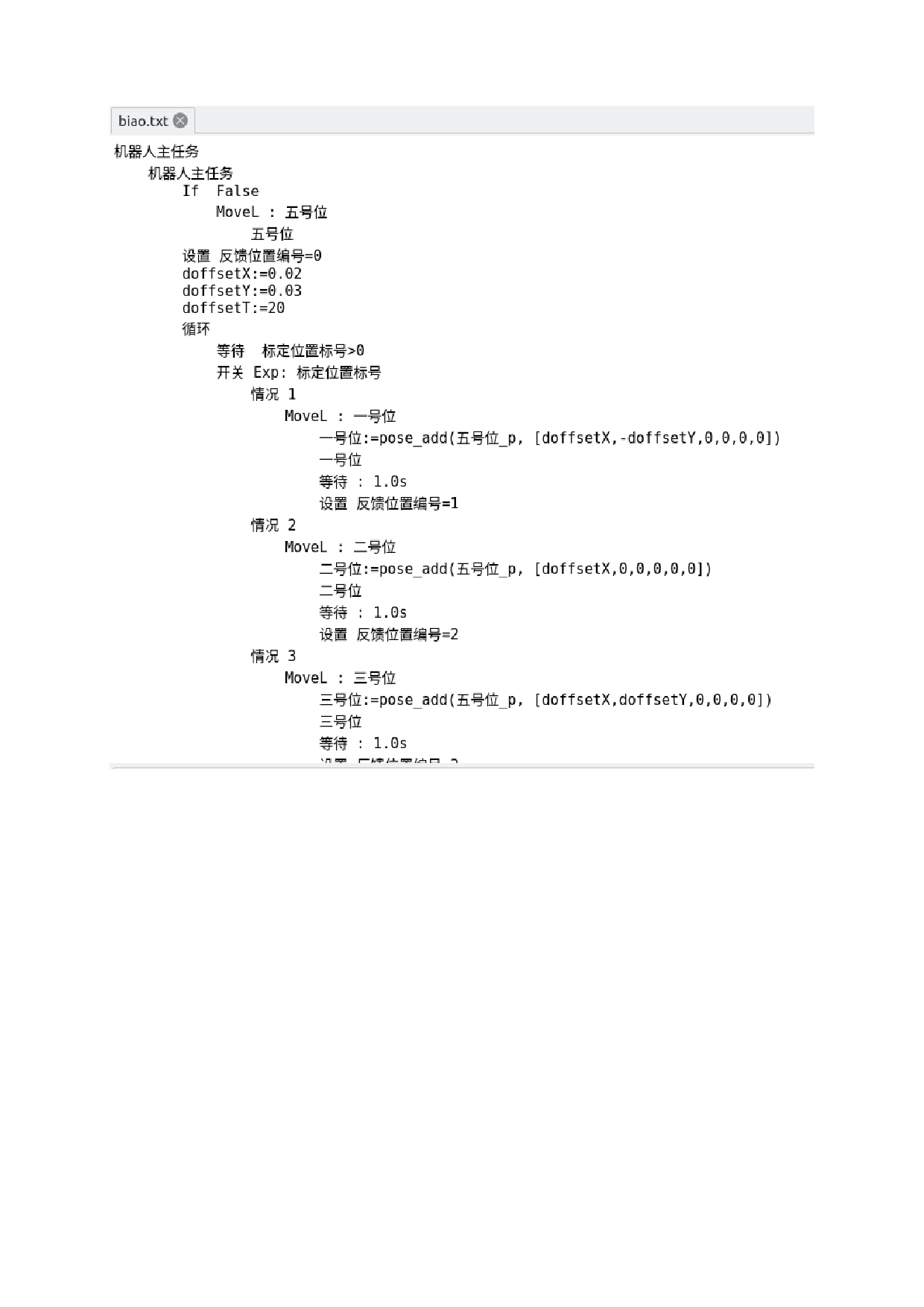 基准位上加上视觉发过来的偏移量(dx,dy,rz),到达纠偏后的取料位。程序如下图 。