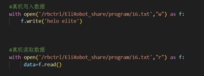 针对真机可以使用如下代码。执行完该代码,用户可以/home/elite/user/program 下看到16.txt 的内容被改写(data为示教器创建全局变量数据)