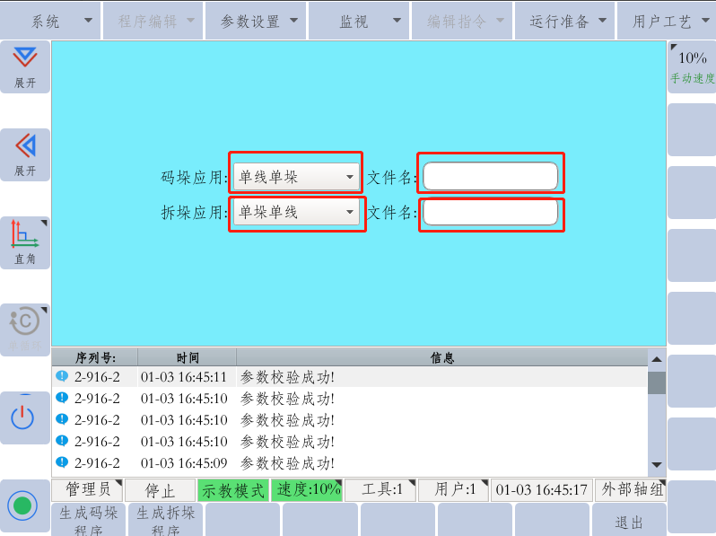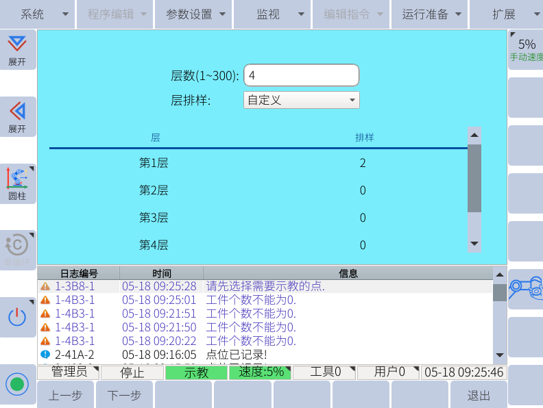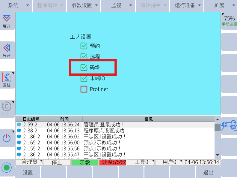 1. 进入管理员模式,选择运行准备-----8. 工艺配置-----勾选码垛,点击左下角的设置,重启后,在右上角的扩展里面会有码垛工艺配置。
