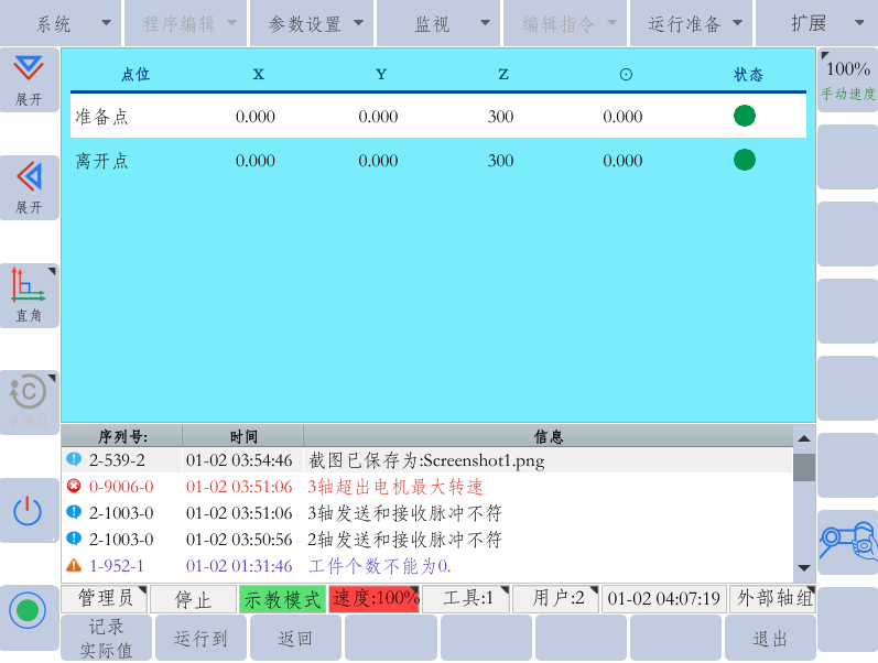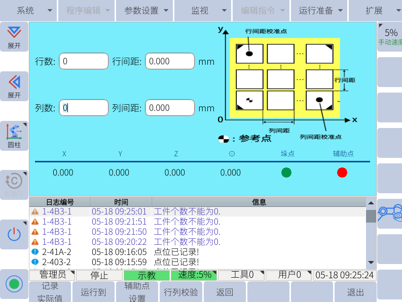 8. 辅助点分为准备点和离开点,就是G22恒峰一般所说的放料位上方位。只需要设置好Z方向的参数。设置好后,会自己计算出垛点的上方位,进行偏移运动。以毫米为单位。