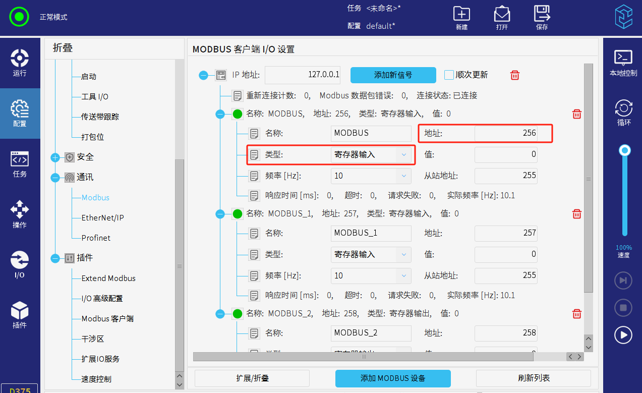 机器人示教器配置--通讯--modbus--添加modbus设备,输入ip(127.0.0.1属于机器人内部mudbus从站内部地址),设置每个信号名称、类型、地址。