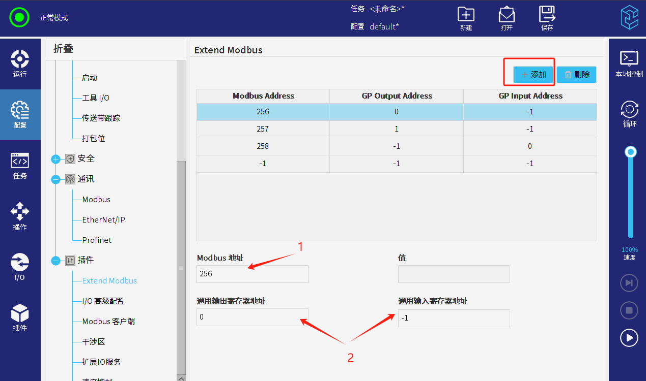 在配置 > 插件 > ExtendModbus,添加modbus寄存器,通用寄存器的映射。modbus可以使用的范围是256-383,通用整型寄存器的范围是0-47