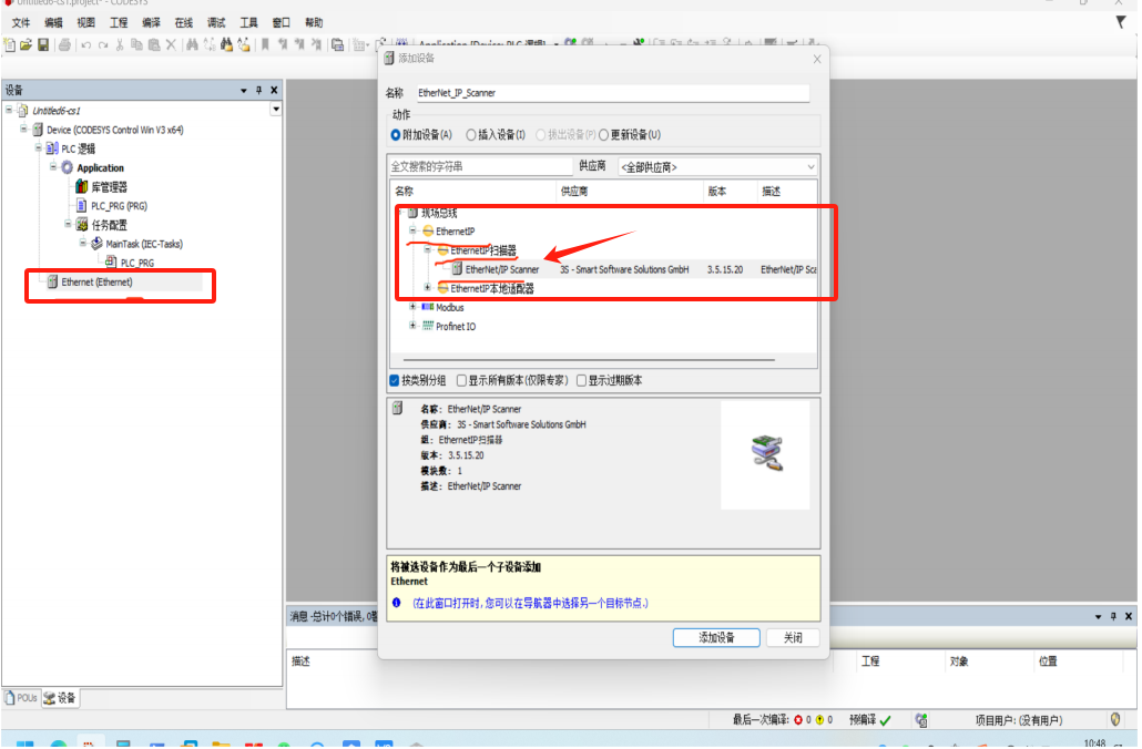 选择 Ethernet-添加设备-EthernetIP-EthernetIP 扫描器-Ethernet/IP Scanner(同样的操作,添加两个Ethernet/IP Scanner)