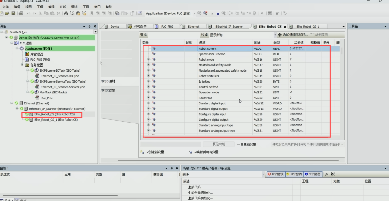 选择Elite_Robot_ CS---Ethernet/IPI/O映射,将ExlusiveOwner-1展开,可看到机器人当前的一些具体信息 (具体报文数据查看附录中的《CS_用户手册_EthernetIP数据格式》文档)