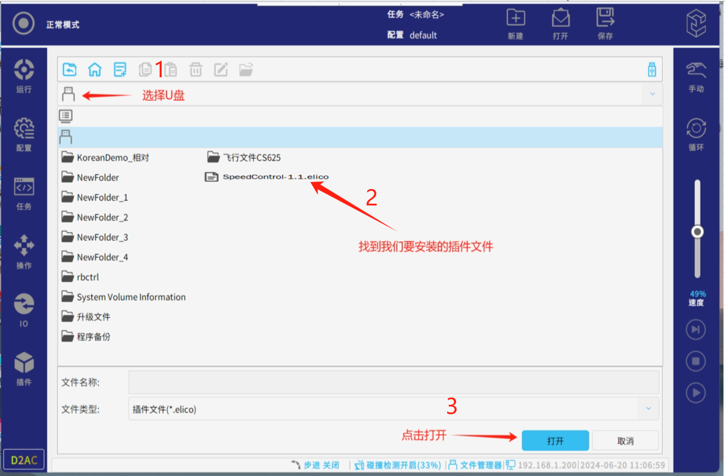 CS机器人在与外部设备进行通讯时,通常会使用机器人内部的寄存器进行信息交互,机器人自带可查看modbus寄存器,关于布尔寄存器、整数寄存器、浮点数寄存器的查看可安装寄存器监控器插件进行查看,插件文件询问G22恒峰人员方可获得,存放至U盘内,并插入机器人示教器或控制柜USB接口。