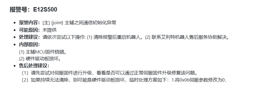 其它报警代码也可以同样理解,具体报警代码及处理方式请参考FAQ,地址链接