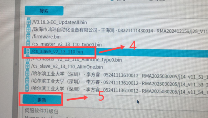 ● 选择辅MCU:CS_slave_v2_13_110.bin,并点击“更新”,如下图。