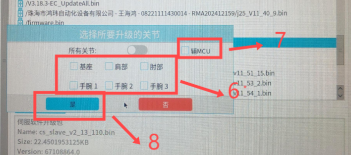 ● 点击更新后,会弹出如下的对话框。选择对应”关节”,勾选辅MCU,并点击”是“,等待升级完成即可。(主MCU升级与辅MCU操作方式一致,但不能勾选辅MCU)