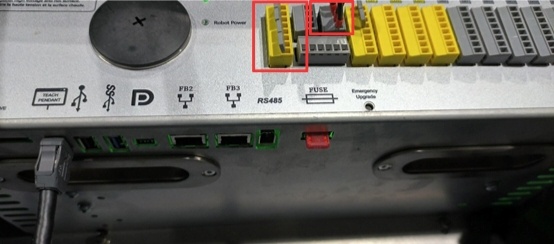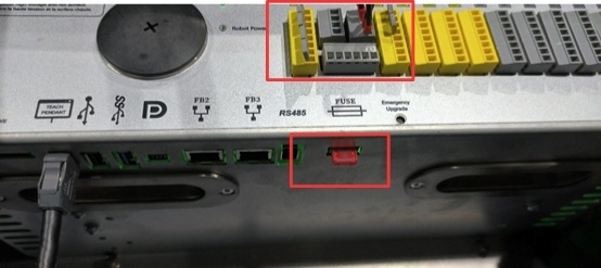 需要用万用表测量控制柜是否有24V输出,测试的地方如图所示(黄色的端子是急停端子,一端口,二端口一对,三端口,四端口一对,)(灰色的端子供电端子,一端口,三端口一对,二端口,四段口一对),也可以断电测量电阻,正常电阻为18KΩ