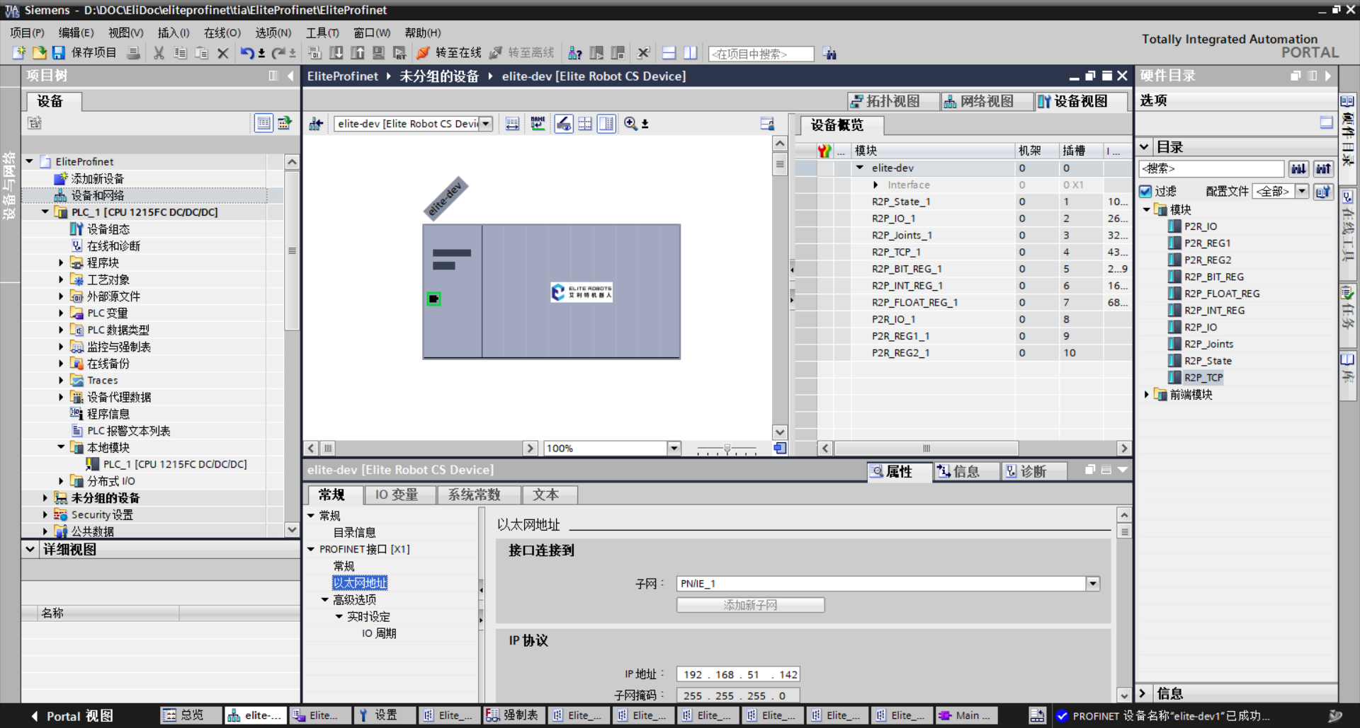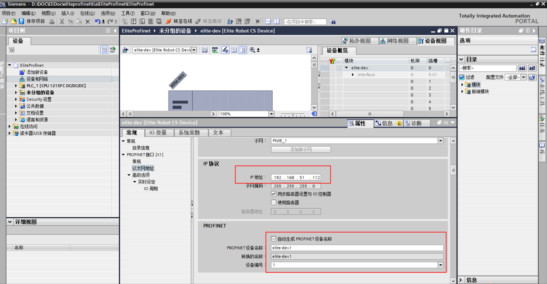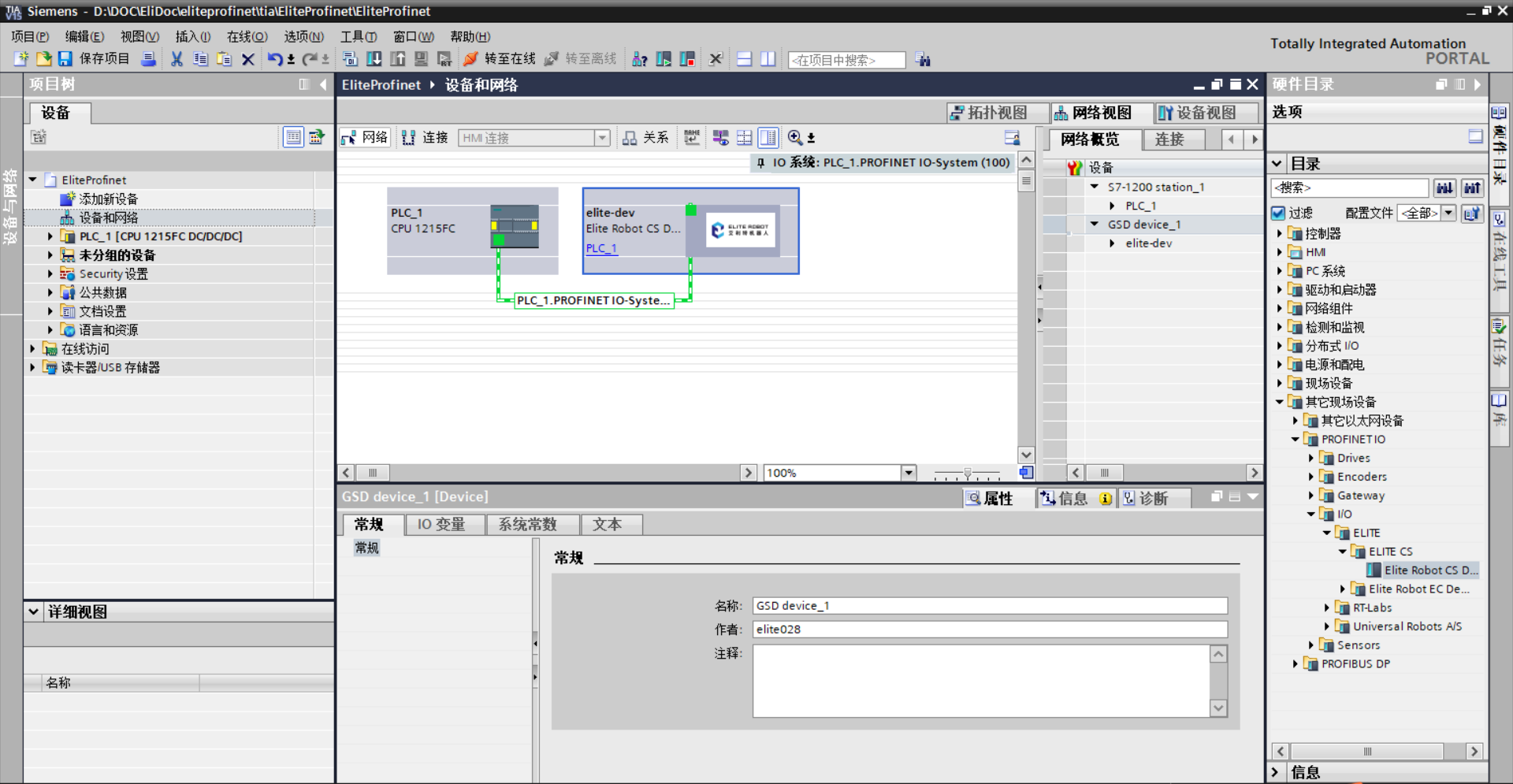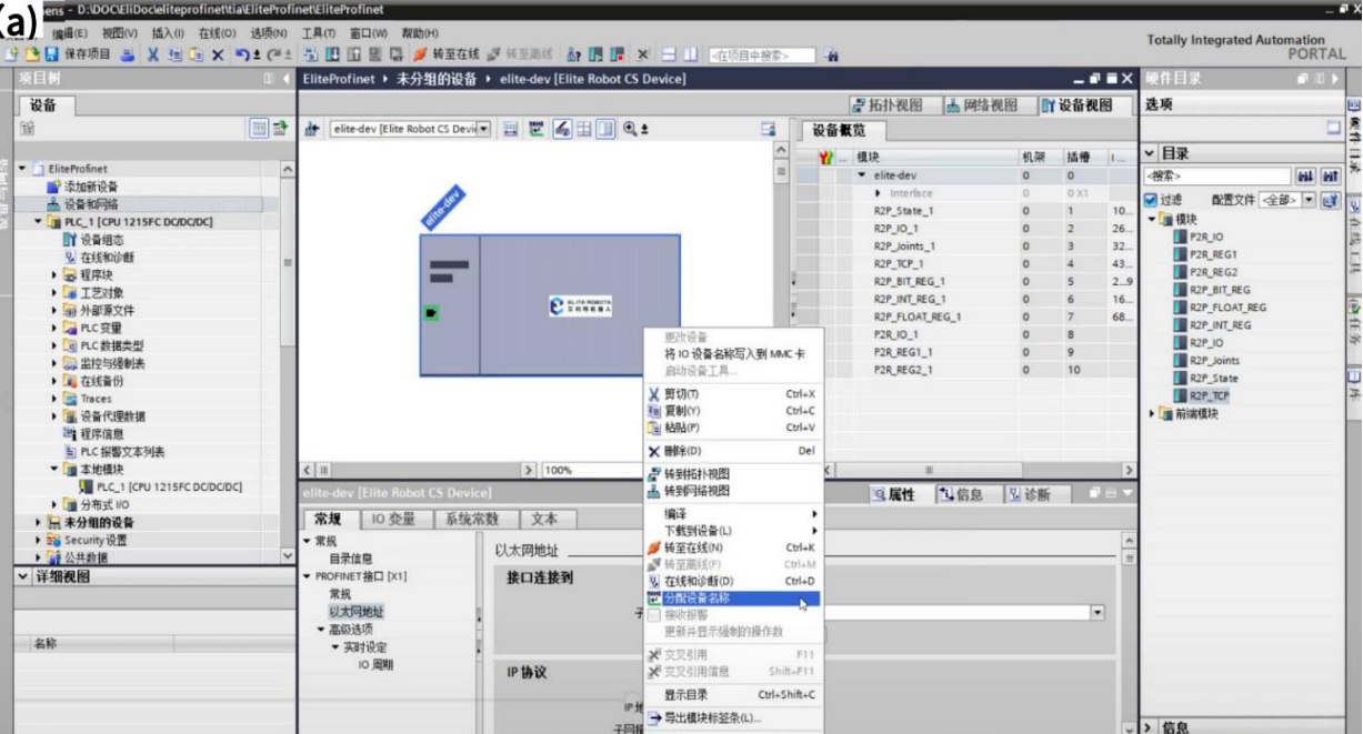 1)双击左侧项目树中的“设备和网络”,如图 3-2(a)所示;双击或拖拽右侧硬件目录 中,具体路径为:“其他现场设备> PROFINET IO> IO> ELITE> ELITE CS> Elite Robot CS Device”,如图 3-2(b)所示。