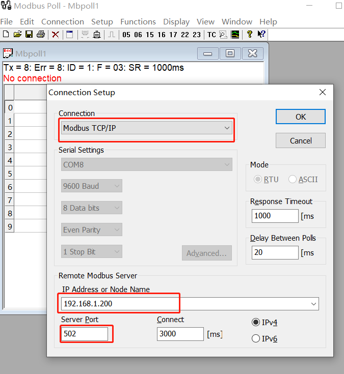 打开第三方网络调试助手modbus poll,--connection--connect,选择modbus tcp/ip,ip地址栏输入机器人的ip,端口默认502,最后点击ok