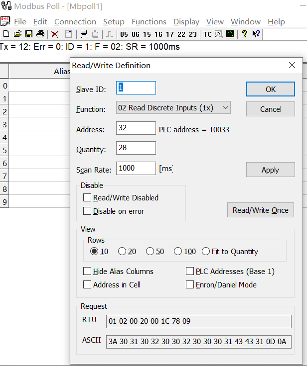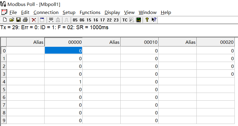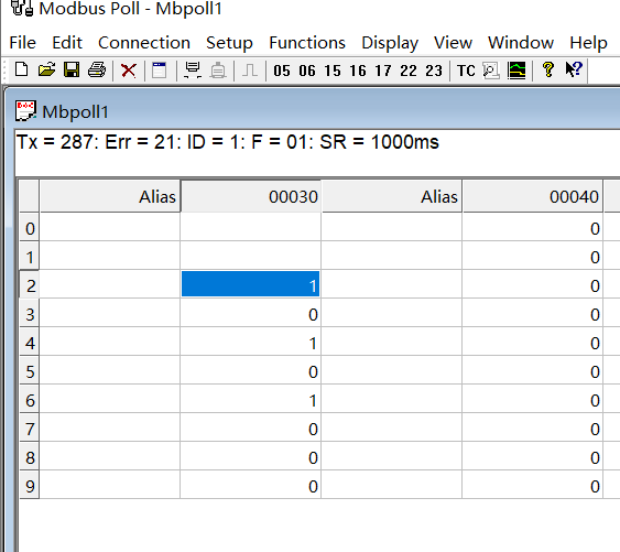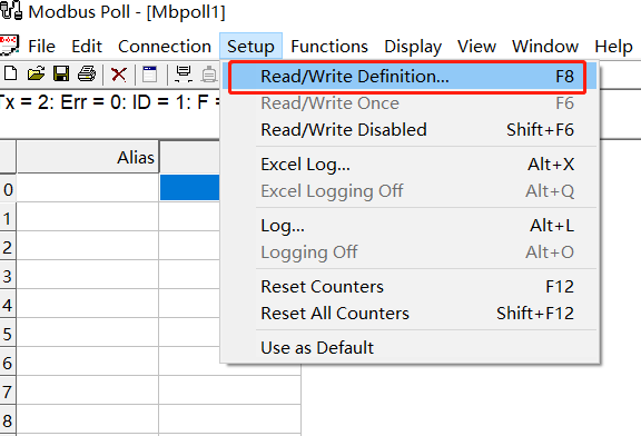 setup--read/write definition中可以先择 01 read coils(0x)读取线圈方便在modbus poll上观察