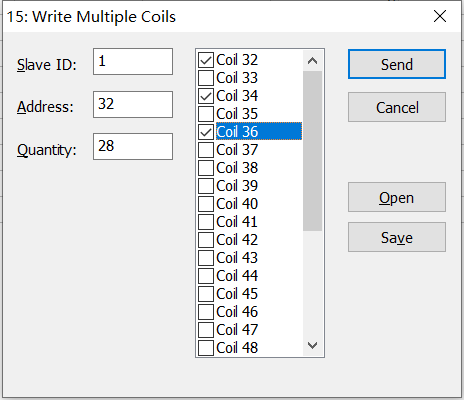 点击functions--选择功能码15:write multiple coils(写多个线圈),勾选所需的coil,点击send,回复respons ok 即可输出信号