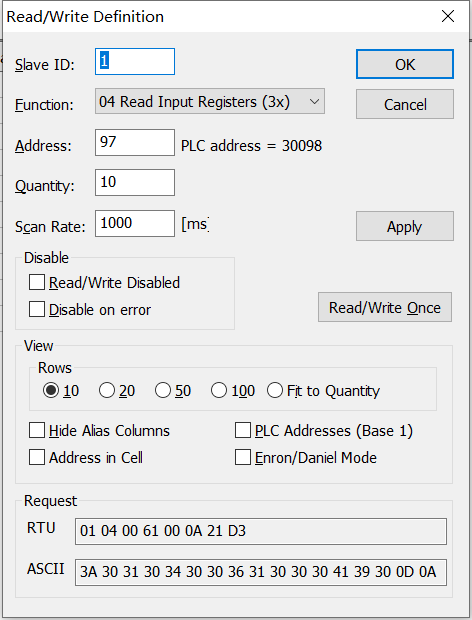 setup--read/write definition中可以先择 功能码04read input registers,十进制,起始地址 97,