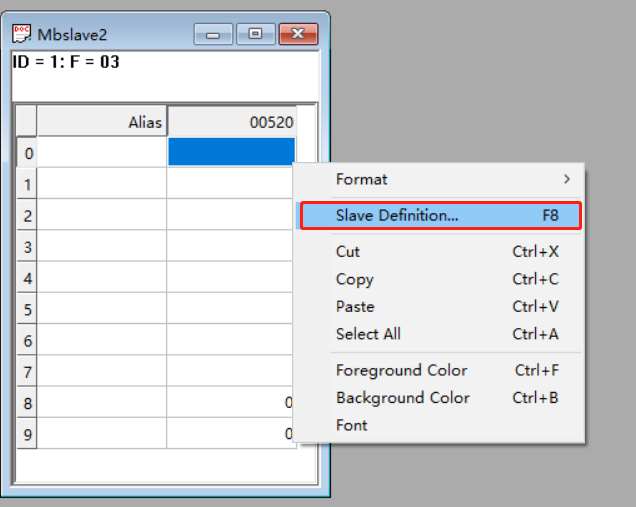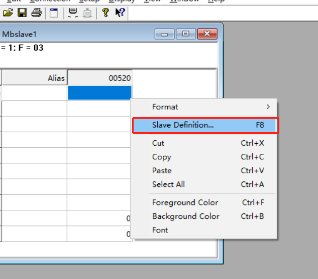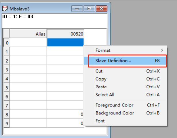 打开modbus slave调试助手,右击名为“mbalave1”窗口,点击slave definition,
