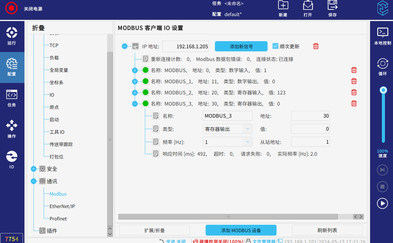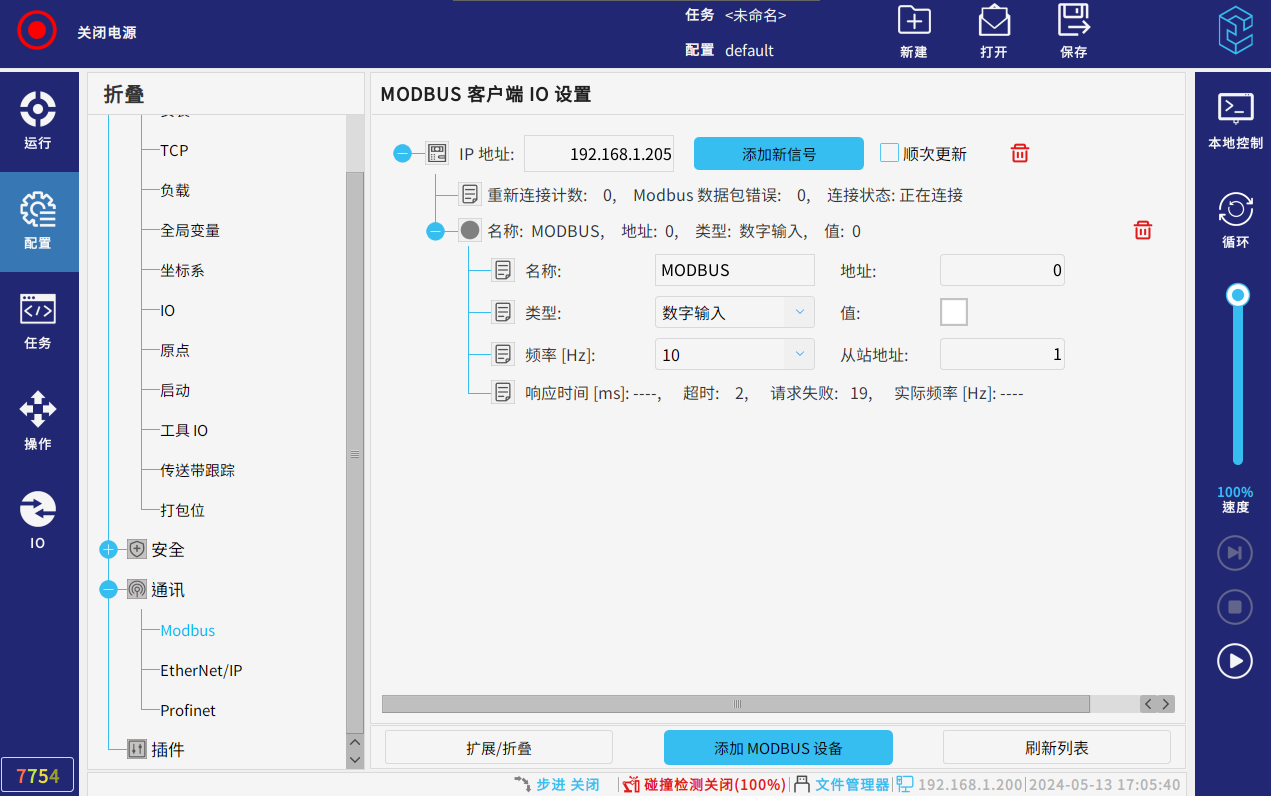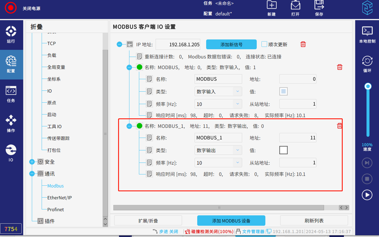 点击机器人示教器配置--通讯--modbus--添加modbus设备,输入ip(此处ip为主站ip)